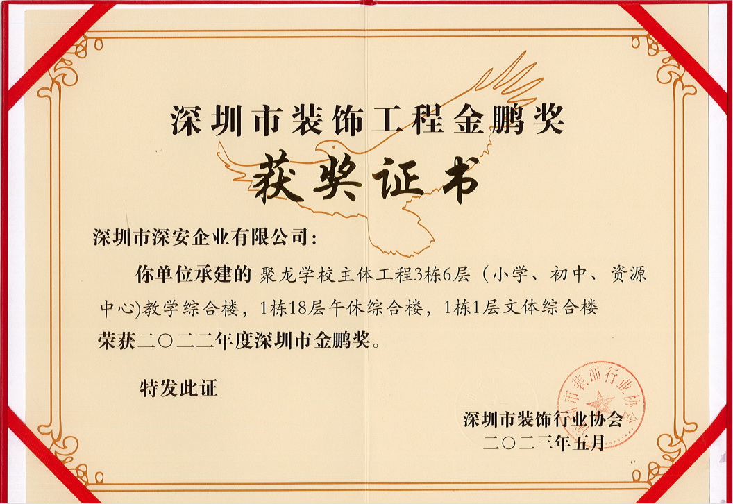 聚龍學校工程榮獲2022年度深圳市裝飾工程“金鵬獎”