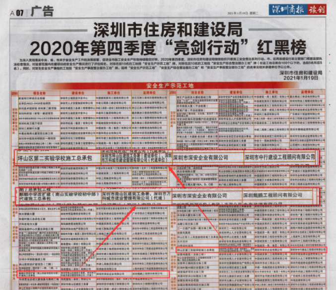 1月19日,深圳市住房和建設(shè)局2020年第四季度“亮劍行動”紅黑榜公布,深安企業(yè)承建的麒麟中學(xué)改擴建項目和坪山第二實驗學(xué)校項目獲列“紅榜”工地。