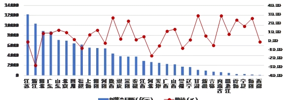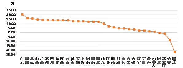 從各地區(qū)建筑業(yè)總產(chǎn)值增長情況看,有 27 個(gè)地區(qū)的建筑業(yè)總產(chǎn)值較上年同期有不同幅度的增長。其中,廣東、新疆、北京的增幅均超過 15%。有 4個(gè)地區(qū)出現(xiàn)負(fù)增長,其中,浙江出現(xiàn)了 超過20% 的負(fù)增長(圖 2)。