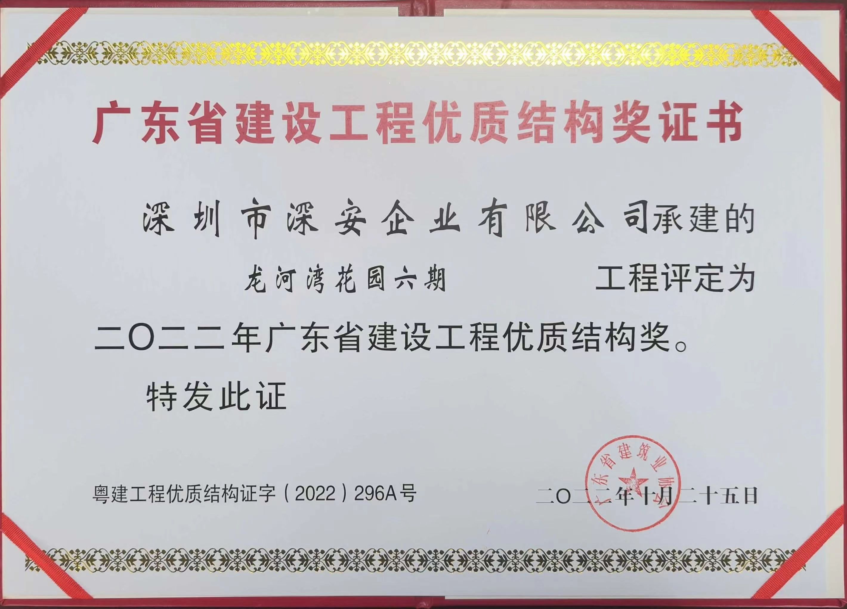 近日,廣東省建筑業(yè)協(xié)會2022年(第三批)廣東省建設工程優(yōu)質結構獎(房屋建筑工程及專業(yè)工程)評審結果公示,深安企業(yè)承建的龍河灣花園六期工程,評定為2022年度廣東省建設工程優(yōu)質結構獎。