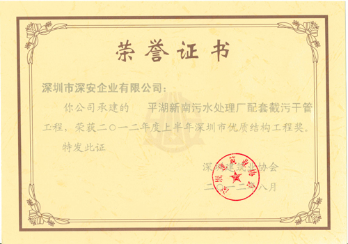 2012年8月10日,深圳建筑業(yè)協(xié)會發(fā)布了《關于表彰2012年度上半年深圳市優(yōu)質(zhì)結構工程獎的決定》,通過專家對企業(yè)申報項目的檢查及驗收、經(jīng)深圳建筑業(yè)協(xié)會工程質(zhì)量工作委員會審定,深安企業(yè)施工承建的平湖新南污水處理廠配套截污干管工程,獲“2012年度上半年深圳市優(yōu)質(zhì)結構工程獎”。