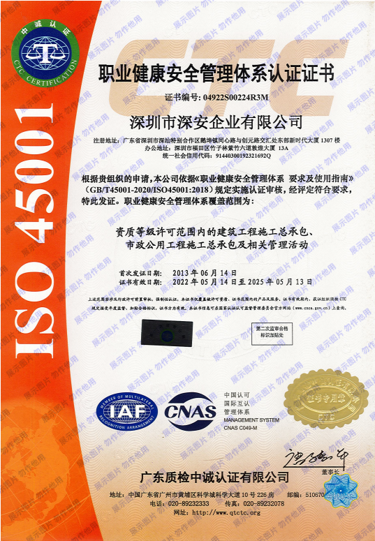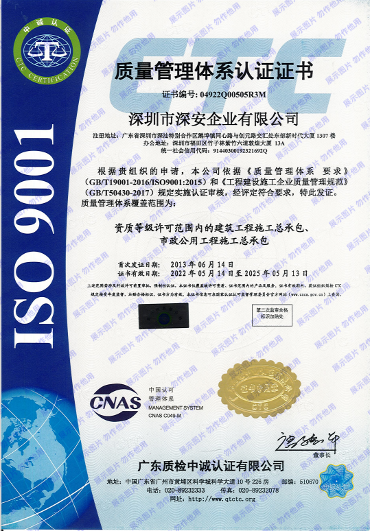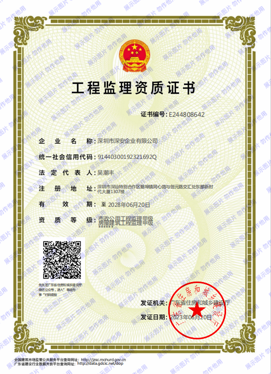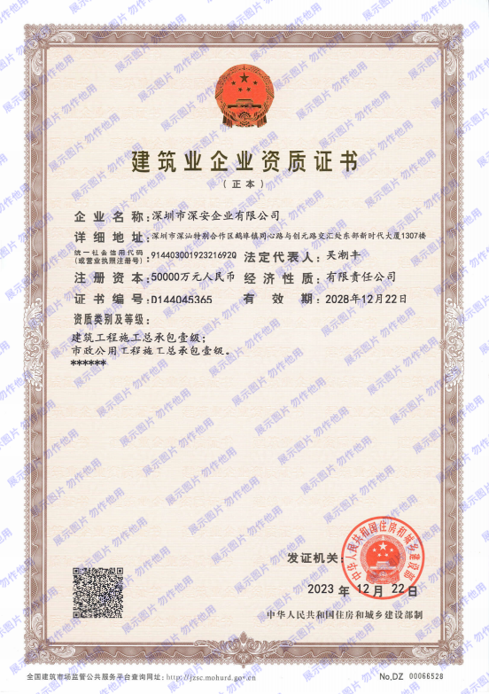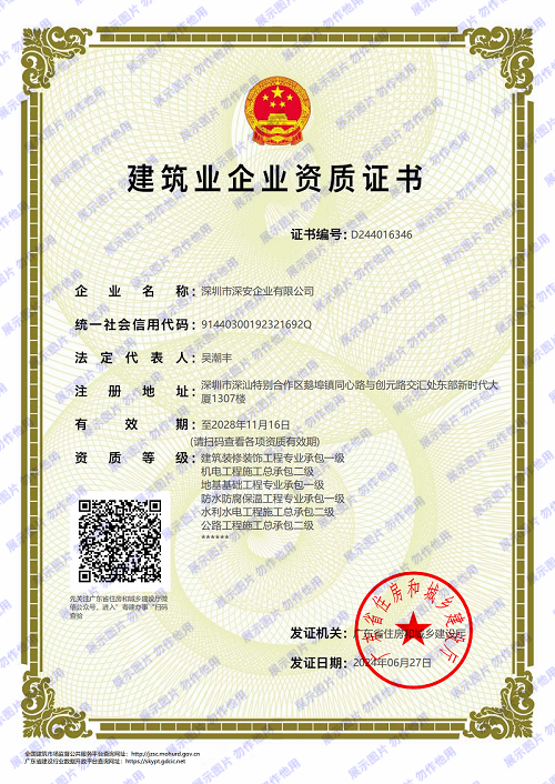 建筑裝修裝飾工程專業(yè)承包一級、機電工程施工總承包二級、地基基礎工程專業(yè)承包一級、防水防腐保溫工程專業(yè)承包一級、水利水電工程施工總承包二級、公路工程施工總承包二級
